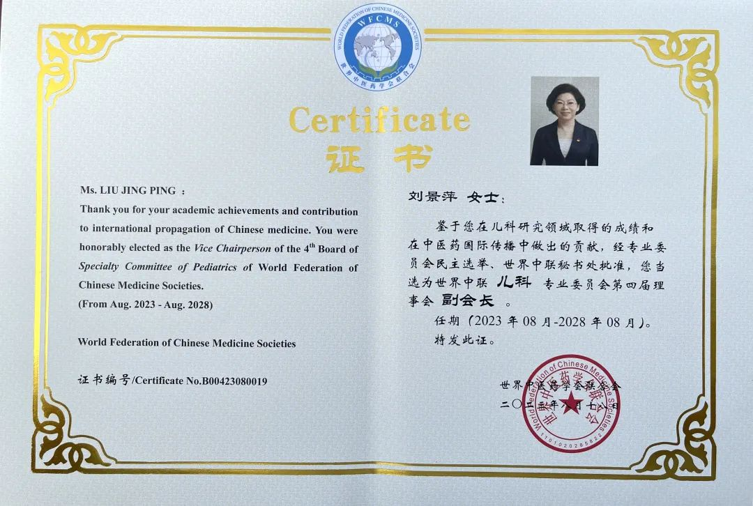 人生就是博药业集团党委书记、董事长刘景萍当选世界中医药学会联合会儿科专业委员会第四届理事会副会长
